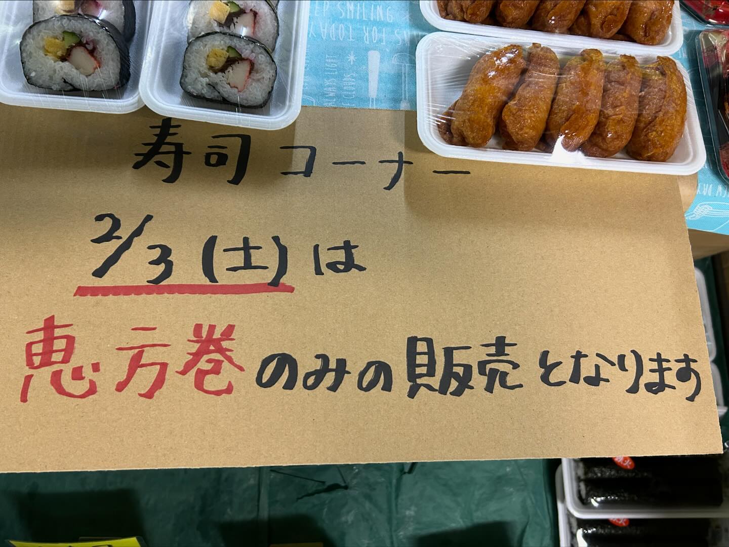 2/3節分の寿司コーナーは恵方巻きのみの販売となります、ご了承ください🙇♂️ ご家族で巻きたいという方には寿司種のパック販売もございます、是非🙇♂️ #節分#恵方巻き#海鮮巻き#福